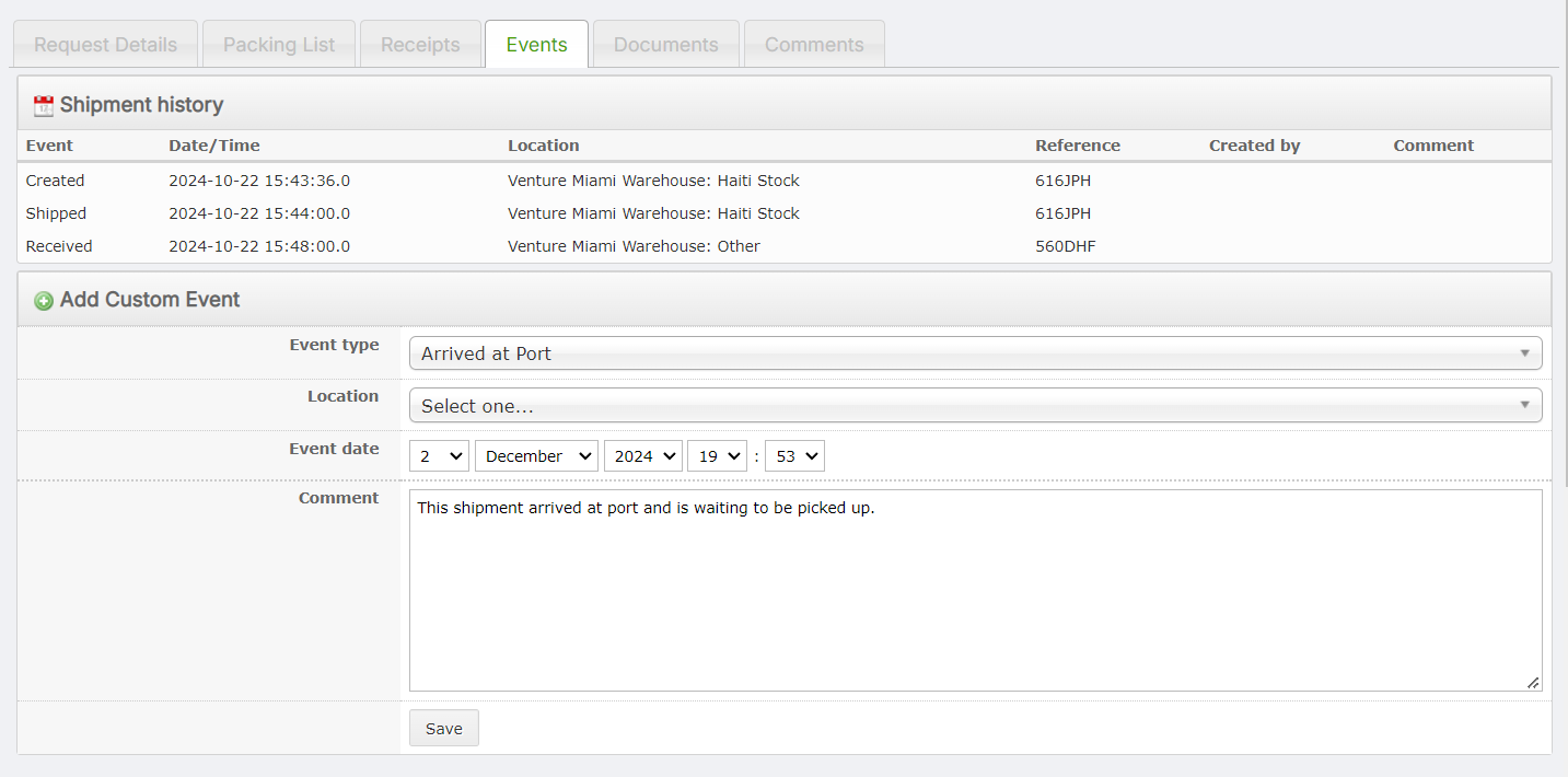 Événements : les utilisateurs peuvent suivre les événements supplémentaires liés aux expéditions dans cet onglet.