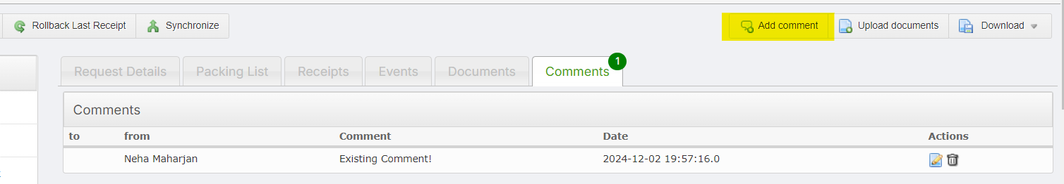 Commentaires : les commentaires existants ajoutés pour l'expédition sont visibles sous cet onglet et indiqués par une info-bulle !
